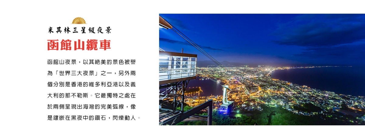 【函館夜景纜車】隨著車廂節節升高,開闊的美麗景色也逐一映入眼簾,函館港區與璀璨的市區燈火在眼前展開,抵達山頂站即為展望台,受惠於兩側為海的地形之利,站在函館山的山頂即可飽覽與義大利拿坡里和香港並稱世界三大夜景之一,宛如寶石般璀璨動人的函館夜景,美的讓人無法用筆墨形容,絕對實至名歸。