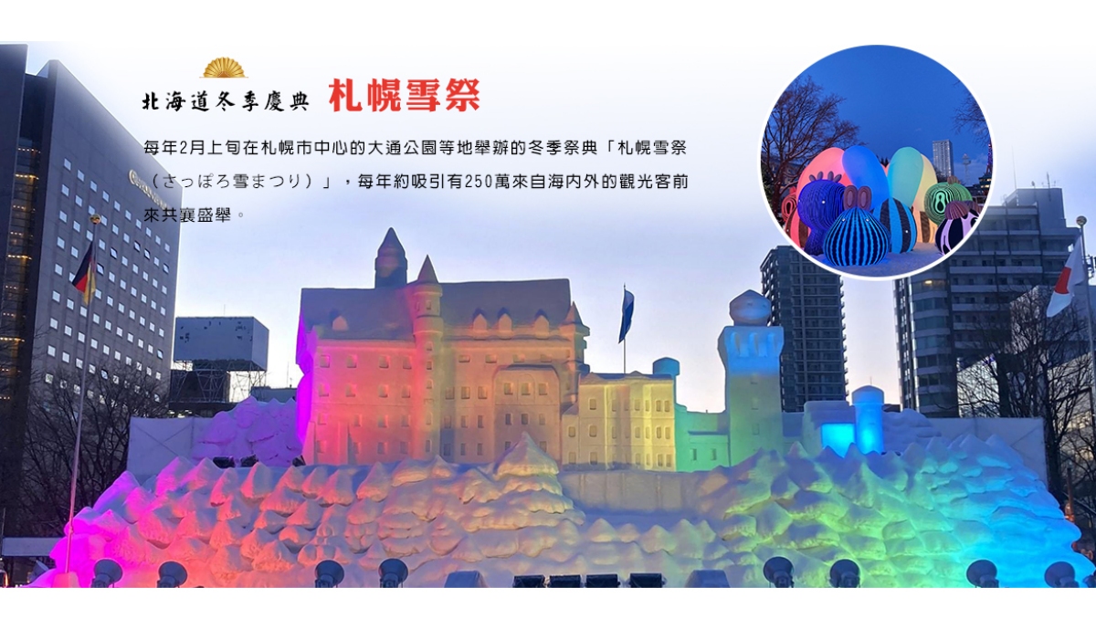 【札幌】札幌位於北海道道央地區,在明治時代作為政府開拓北海道的中心地帶得到繁榮發展,整體城市規劃井然有序,四周綠地環繞,完美融合都市風貌與自然景觀。此外札幌還是著名的美食王國,從海鮮肉類到蔬菜水果,都能品嚐到鮮美食材,除了刺身壽司,還是湯咖哩和成吉思汗烤肉的發祥地,更以味噌拉麵聞名日本。