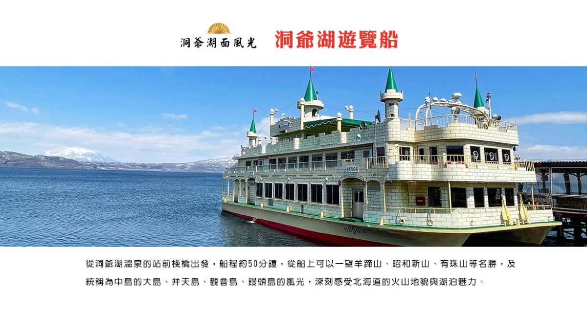 【洞爺湖遊覽船】航行在11萬年前火山噴發形成的洞爺湖上的遊覽船,有「希望號」和「羊蹄號」兩種船型。從洞爺湖溫泉的站前棧橋出發,船程約50分鐘,從船上可以一望羊蹄山、昭和新山、有珠山等名勝,及統稱為中島的大島、弁天島、觀音島、饅頭島的風光,深刻感受北海道的火山地貌與湖泊魅力。