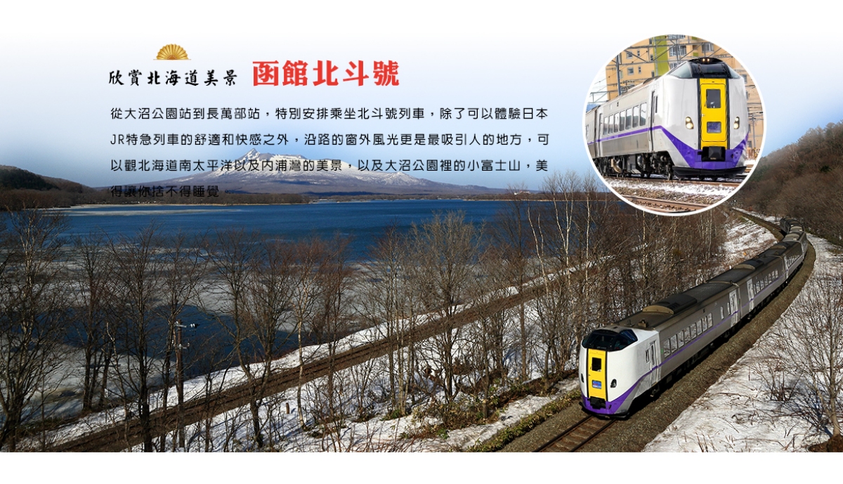 【函館北斗號】從大沼公園站到長萬部站,特別安排乘坐北斗號列車,除了可以體驗日本JR特急列車的舒適和快感之外,沿路的窗外風光更是最吸引人的地方,可以觀北海道南太平洋以及內浦灣的美景,以及大沼公園裡的小富士山,美得讓你捨不得睡覺。