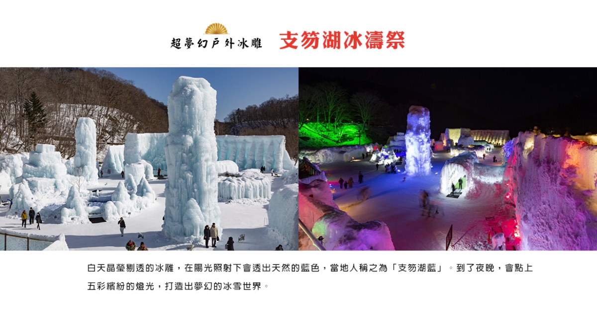 【支芴冰濤祭】活動利用支笏湖清澈湖水噴灑並自然凍結,形成各式冰雕與建築,白天映照自然光呈現晶瑩剔透的「支笏湖藍」,夜晚則以彩燈點亮,營造夢幻繽紛的氛圍,並搭配煙火秀增添熱鬧氣息。會場分為冰之美術館、天空回廊、溜冰場與滑雪梯等主題區域,遊客可體驗冰雪遊樂設施、騎馬活動,適合各年齡層參觀。