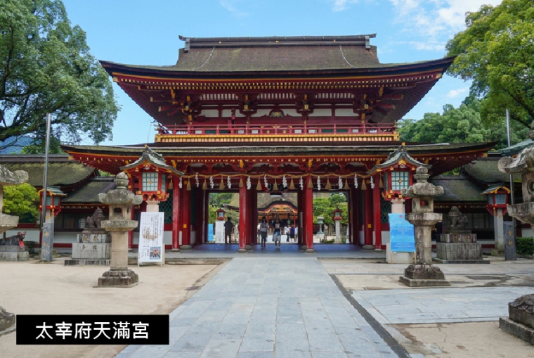 【太宰府天滿宮】為日本一萬三千座天滿宮的總殿,寶物殿內有國寶翰苑,歷史館內記載菅原道真公一生的事蹟,庭園內則有一株千年樟木、六千株梅樹及三萬株菖蒲花,美麗多姿。桃山時代的山型牆建築,使其成為日本重要的文化財產,寺外更有一條將近2000公尺長的石道,兩側均是土產精品及飲食店,讓您眼花撩亂。