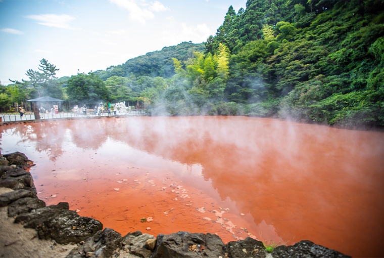 【血池地獄】血池地獄是日本最古老的天然地獄溫泉,自然的化學反應發生在地底深處的高溫高壓環境中,導致氧化鐵和氧化鎂混合,這種混合形成了赤紅色的熱泥,被推到地表上,並把整個池塘轉變成赤艷的顏色。直到現在每天仍約有1800公斤的熱水從池塘中噴湧而出,藉此產生的蒸氣全年穩定地增長。