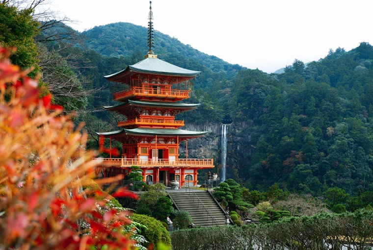 【青岸渡寺】位於那智瀑布的前方,寺內鮮紅的三重塔巧妙融合了人造建築與自然景致,透過三重塔及那智瀑布形成了所有攝影師及網紅們超愛拍攝的打卡景點。除著名的朱紅色三重塔外,青岸渡寺內還有許多其他值得深入探索之處。事實上,青岸渡寺是熊野地區最古老的寺廟建築,擁有許多重要的文化財產。