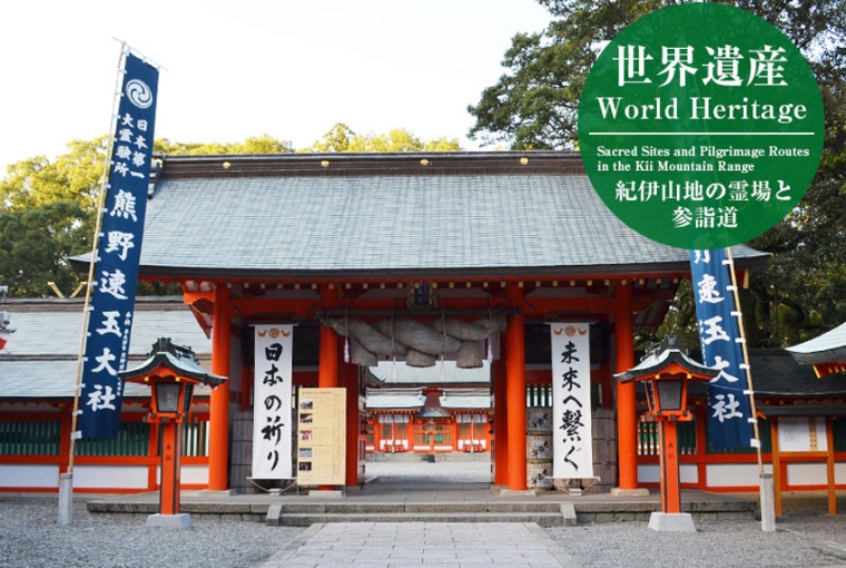 【熊野速玉大社】為和歌山縣的神社。與熊野本宮大社、熊野那智神社並列熊野三山之一,是全國3000多所熊野神社的總部。寺廟所在地山高林密,海拔高逾4千米的山岳地帶,據傳說這帶是神靈聚居地,在西元10世紀前後, 速玉大社連同其他兩個神社:本宮大社,那智大社,被共稱為 「熊野三山」也是日本神話中為一個重要的神聖地點,而這三神社頓時成為日本朝聖者心中的聖地,被聯合國教科文組織認定為世界遺產。院內聳立著被指定為自然紀念物的參天大樹-竹柏。是一棵據推斷樹齡有1000年的古樹,被稱為“御神木”,從很久以前就有為祈求旅行途中安全,將大樹的樹葉,放入懷中的習俗。
