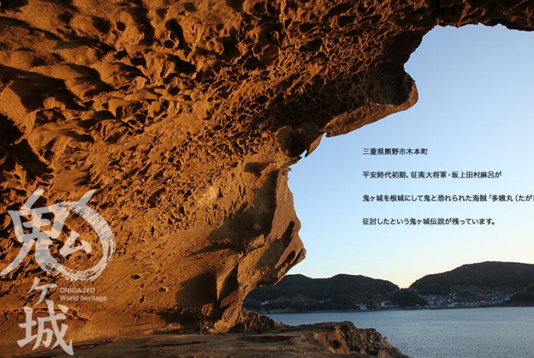【鬼城】奇岩怪石所形成天然紀念物,由於岩壁長年受到海風吹拂及海水侵蝕,造成海邊突出的峭岩約一公里的海蝕洞窟以及千層石形成的奇岩怪石,如:犬、猿、蜂巢等十分奇特。被指定為國家名勝.天然紀念物。由岩石上往下看海浪拍打在岩石上而濺開的白色浪花,非常有魄力。