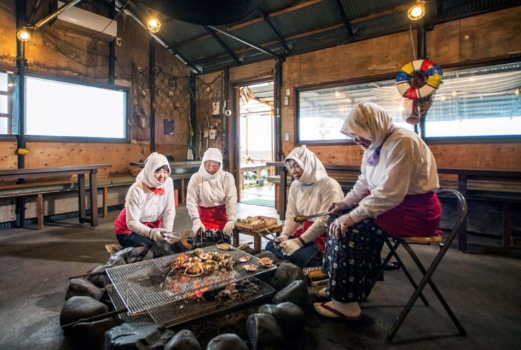 【海女小屋】在這裡可以一邊享用美食,一邊聆聽海女的故事。在爐灶旁,經驗豐富的海女會談論自由潛水和他們的日常生活。享用由海女在木炭上灶烤的新鮮食物。這是可以盡情享受伊勢志摩美味的豪華特別體驗。