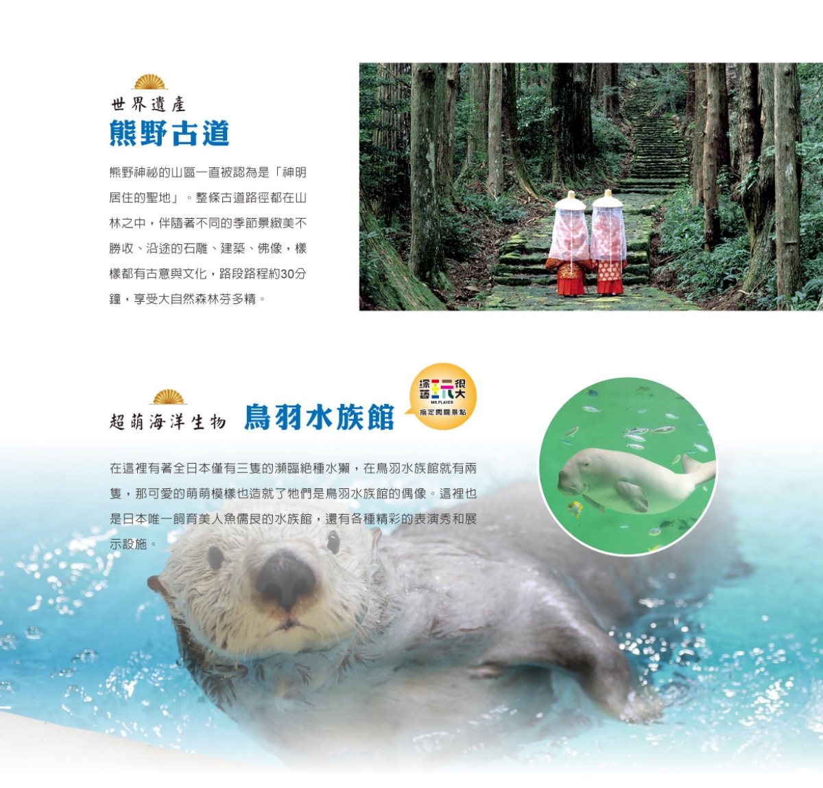 【超萌~鳥羽水族館】鳥羽水族館的生物種類為全日本第一。在這裡有著全日本僅有三隻的瀕臨絕種水獺,在鳥羽水族館就有兩隻,那可愛的萌萌模樣也造就了牠們是鳥羽水族館的偶像。這裡也是日本唯一飼育美人魚儒艮的水族館,還有各種精彩的表演秀和展示設施。除了展示非洲海牛的飼育,和可以行走在水中透明水管的「海獸王國」之外,在「伊勢志摩之海/日本之海」區域裡,也能看到江豚可愛的身影。以飼育廣泛種類生物的水族館而深受遊客喜愛。超可愛的水豚君、海獅秀以及長期飼育儒艮的世界紀錄,還有世界第一個鸚鵡螺三世誕生等,鳥羽水族館還擁有眾多飼育、研究成績。
