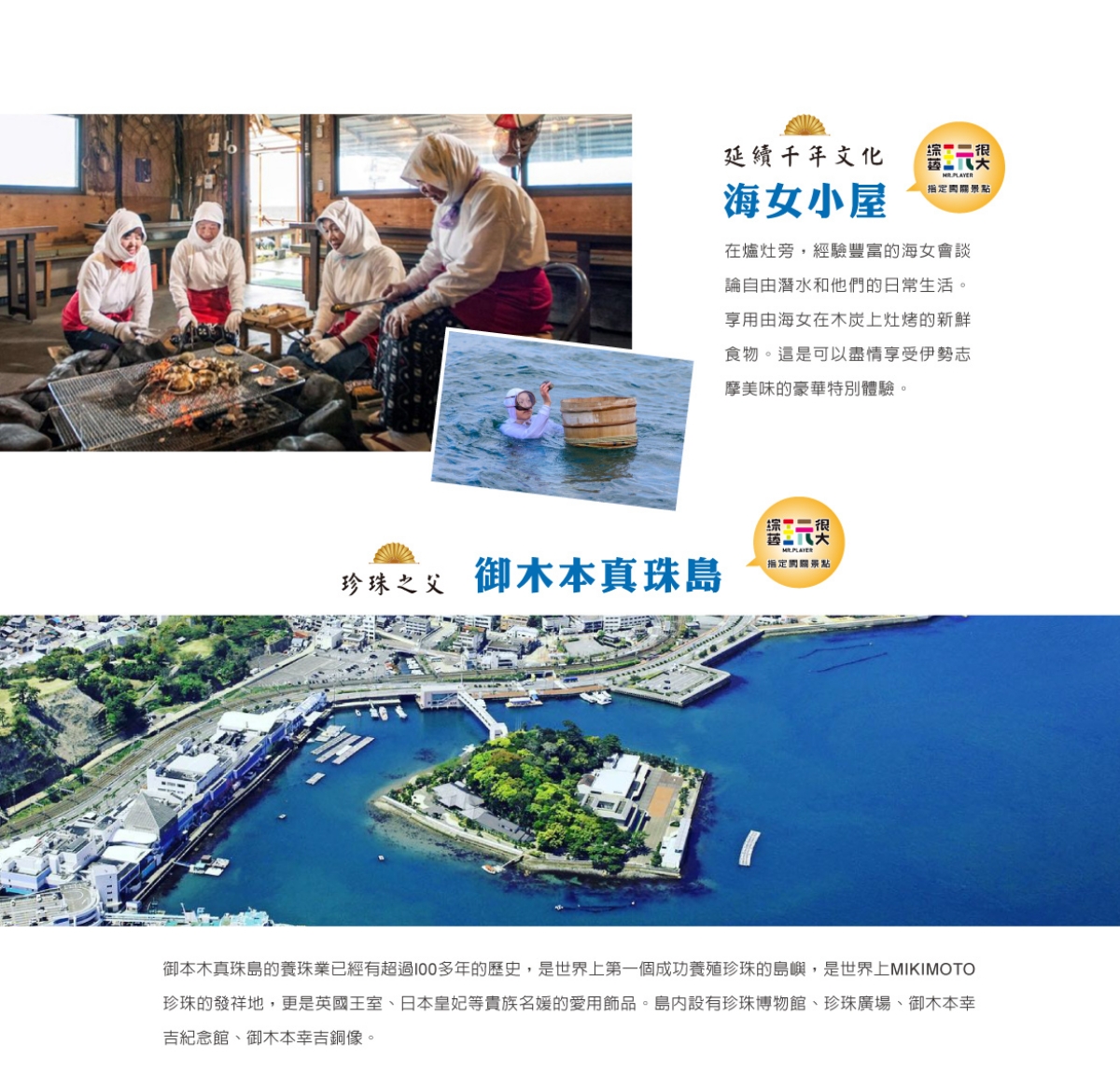 【珍珠之父~御木本真珠島】御本木真珠島的養珠業已經有超過l00多年的歷史,是世界上第一個成功養殖珍珠的島嶼,是世界上MIKIMOTO珍珠的發祥地。更是英國王室、日本皇妃等貴族名媛的愛用飾品。島內設有珍珠博物館、珍珠廣場、御木本幸吉紀念館、御木本幸吉銅像。在博物館中可以了解養珠業的過程、觀賞海女潛水作業,海女潛水時不使用氧氣罩,只單憑著呼吸即可在水中來去自如。不單是要有潛水的技術,還需要在短時間內找到貝殼的技巧,是個需要豐富經驗的職業。
