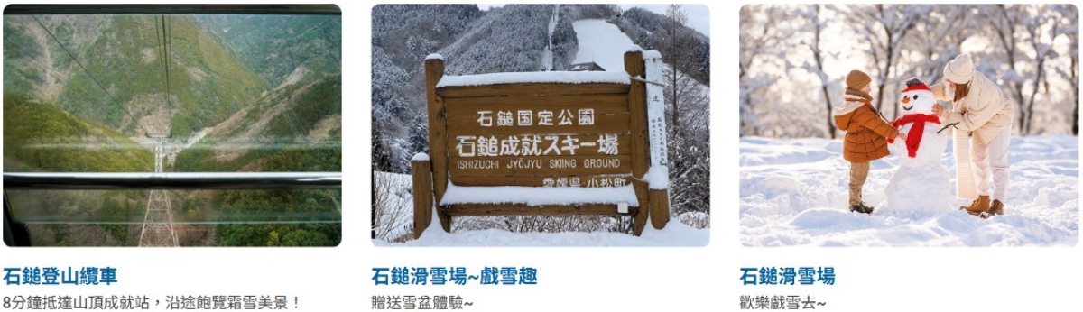 ※特別說明:如遇雪量不足或天候不佳等不可抗力因素、致雪場未開放或纜車停駛等狀況不克前往時,則行程調整為今治毛巾美術館,不另做退費,敬請諒解!