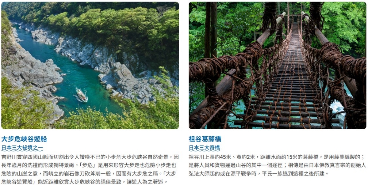 【秘境祖谷溪~葛藤橋】四國中部的祖谷地區,自然壯觀的美景為日本三大秘境之一,祖谷屬於劍山國定公園,四國第二高峰的劍山為四國山地的群峰所包圍,形成吉野川源頭的祖谷川的清流,蜿蜒曲行於群山之間形成深深溪谷。祖谷川上長約45米、寬約2米,距離水面約15米的葛藤橋,是用藤蔓編製的。是日本三大奇橋之一,被指定為國家的重要民俗文化財產。