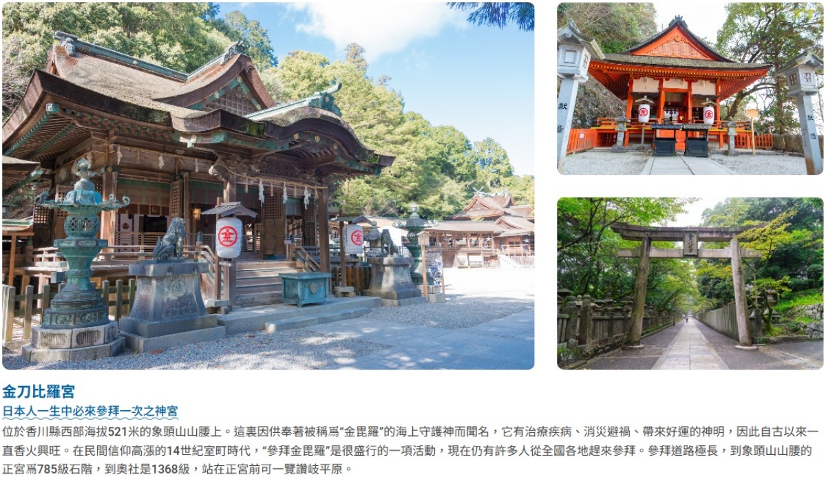 【金刀比羅宮】位於香川縣西部海拔521米的象頭山山腰上。這裏因供奉著被稱爲“金毘羅”的海上守護神而聞名,它有治療疾病、消災避禍、帶來好運的神明,因此自古以來一直香火興旺。在民間信仰高漲的14世紀室町時代,“參拜金毘羅”是很盛行的一項活動,現在仍有許多人從全國各地趕來參拜。參拜道路極長,到象頭山山腰的正宮爲785級石階,到奧社是1368級,站在正宮前可一覽讚岐平原。