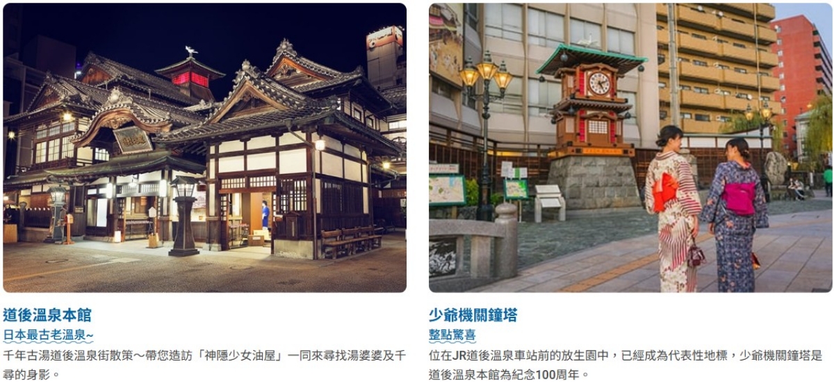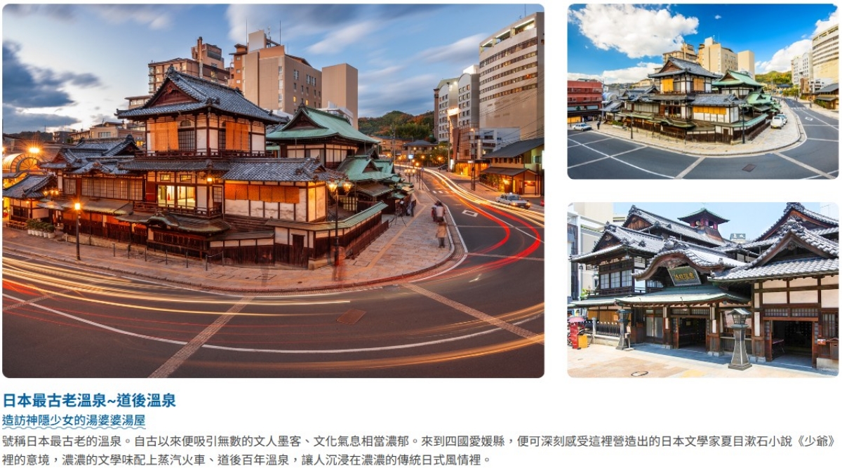 【道後溫泉古街】據說約3000年前開池,號稱日本最古老的溫泉。自古以來便吸引無數的文人墨客、文化氣息相當濃郁。來到四國愛媛縣,便可深刻感受這裡營造出的日本文學家夏目漱石小說《少爺》裡的意境,濃濃的文學味配上蒸汽火車、道後百年溫泉,讓人沉浸在濃濃的傳統日式風情裡。