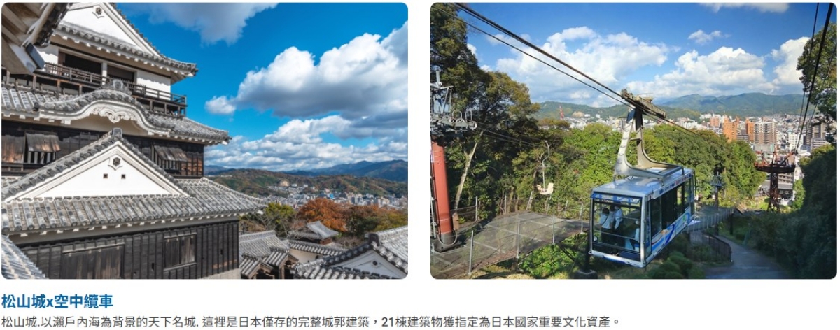 【松山城】四國著名的城廓松山城雄踞在海拔132公尺的勝山山頂,在日本全國僅存12座的現存天守之中,松山城是擁有位置最高海拔的城堡,由築城名人加藤嘉明於1602年開始築城,歷經25年歲月於1627年完成。松山城是日本江戶時期末期的重要城堡,其城樓、乾櫓、戶無門等21棟建築,被評定為日本國家級重要文化遺產,是著名歷史古蹟景點。松山城享有別名金龜城或是立龜城,因為傳說中松山城築城時在山下的護城河裏住著金色的烏龜。