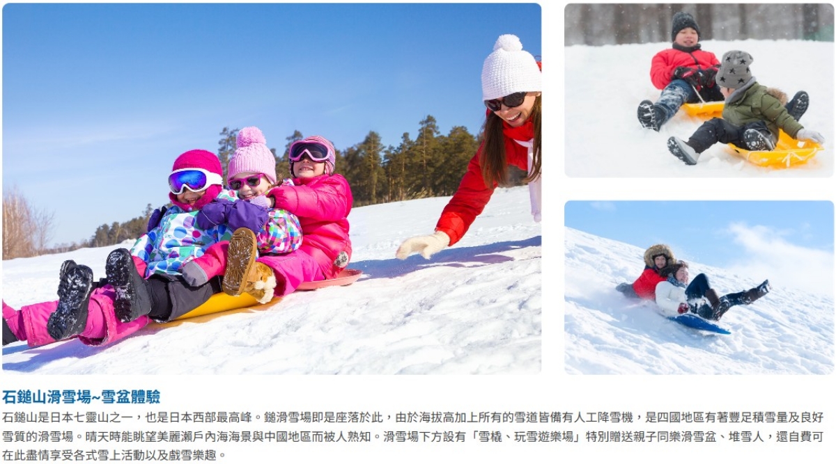 【石鎚山成就滑雪場(贈送雪盆體驗)】石鎚山是日本七靈山之一,也是日本西部最高峰。鎚滑雪場即是座落於此,由於海拔高加上所有的雪道皆備有人工降雪機,是四國地區有著豐足積雪量及良好雪質的滑雪場。晴天時能眺望美麗瀨戶內海海景與中國地區而被人熟知。滑雪場下方設有「雪橇、玩雪遊樂場」不管是親子同樂滑雪盆、堆雪人,皆可在此盡情享受各式雪上活動以及戲雪樂趣。