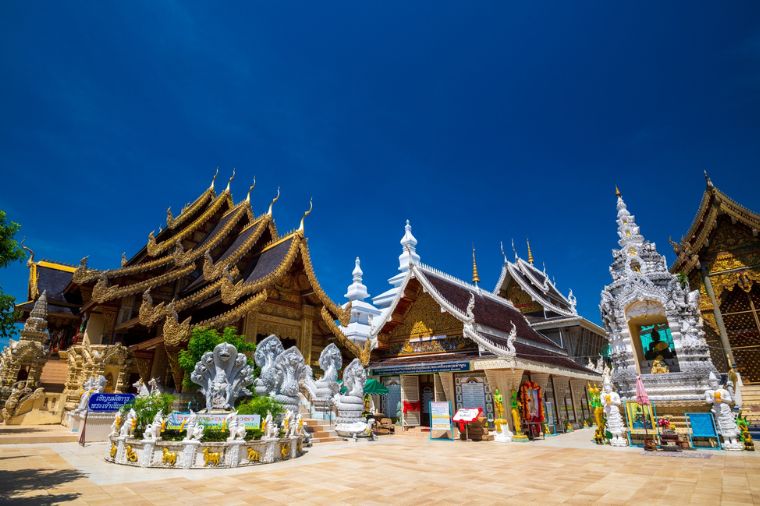 又稱班頓寺,是位於清邁湄登區(Mae Taeng)的一座宏偉寺廟群,以其鮮豔的藍色頂棚、精美的蘭納風格建築和豐富的雕塑而聞名,佔地廣闊,包含多個佛殿和佛塔,氣勢磅礴,是泰北最具代表性的宗教藝術地標之一,與清萊的白廟、黑廟齊名,但歷史更為悠久,風格獨特。 觀看令人震撼的雕塑,漂亮的建築。寺廟是蘭納和緬甸風格的混合。周圍還有數不盡的建築,都是十分的精緻美麗。木製,玻璃,磚,金,鑲嵌工藝等,每一幢建築都像一個藝術品,是一個迷人的景點!