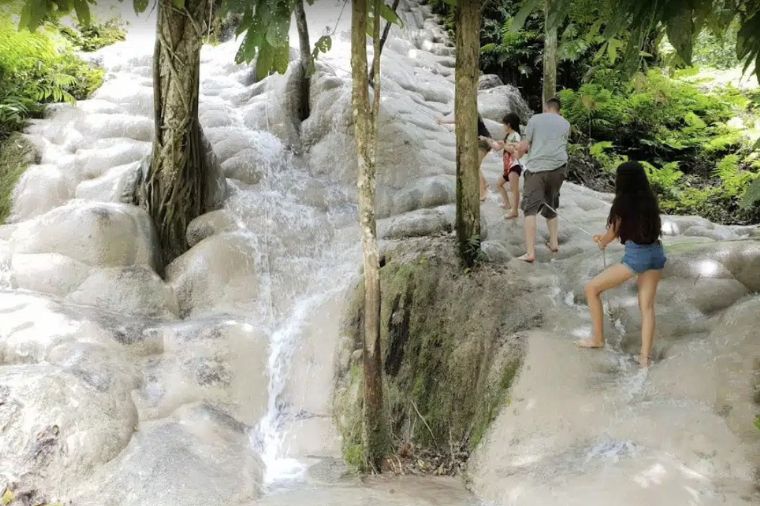 位於清邁市以北湄登區的卜阿潼瀑布(又名黏黏瀑布),並非一般觀賞性景點,而是一座可以爬的瀑布!卜阿潼瀑布高約100米、坡度約50度,是一座4層式中型瀑布,其獨特之處是呈乳白色的水質有高含量的碳酸鈣,經過長年累積後,水流下的石灰岩表面形成了一層天然的防滑膜,非但不滑腳,還有種黏黏的感覺,故當地人一般稱這裡為「Sticky Waterfall」。遊客可以在瀑布旁邊的樓梯走到最底層,再化身做蜘蛛俠徒手赤腳由瀑布底部攀登上頂端,部分位置還設有繩索輔助,體驗好玩又有趣,很多本地人及外國家庭都喜歡帶孩子(只限七歲或以上)來這裡玩水爬瀑布,是大熱天的最佳消暑景點。